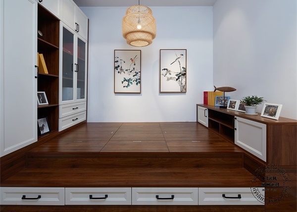 榻榻米最早源于日本,自帶一點禪意,既可以當次臥又可以作為書房,一般榻榻米兩端會設置稍矮的儲物柜與稍高的衣柜或展示柜,既能儲物又顯得空間豐富不單調。