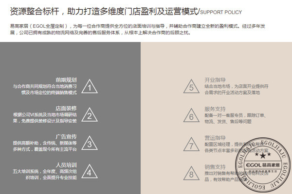 對于加盟商來說,可靠的企業(yè)是他們的后盾,但是對于企業(yè)來說加盟商是他們發(fā)展的基石。有的定制家具企業(yè)往往忽視兩者之間的關(guān)聯(lián)。只有能看透本質(zhì)的定制家具企業(yè)才能發(fā)展壯大,易高家居對于定制家具加盟商提供全面化的扶持政策:前期規(guī)劃-店面裝修-廣告宣傳-人員培訓(xùn)-開業(yè)指導(dǎo)-服務(wù)支持-營運知道-服務(wù)支持等,攜手廣大加盟商共創(chuàng)未來。全面扶持政策作為定制家具發(fā)展新規(guī)劃|發(fā)展前景之一,你了解到了嗎?