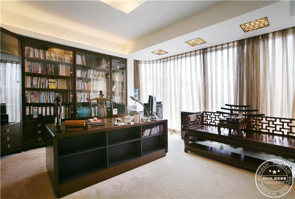 文化的交流與碰撞具有巨大的魅力,中式造型配以現代設計元素,整個書房的空間顯得更加豐富,大而不空,厚而不重,有格調又不顯得壓抑,使得書房環境本身就迸發出厚重的文化因子。