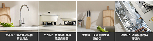收納區(qū)、烹飪區(qū)、洗滌區(qū)、儲(chǔ)物區(qū)、置物區(qū)等,我們經(jīng)常能聽到櫥柜的黃金三角區(qū),也正是存在于洗滌區(qū)、烹飪區(qū)、儲(chǔ)物區(qū)之間,可日常操作減少60%往返路程和27%的操作時(shí)間,