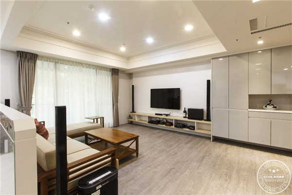 電視柜與裝飾收納柜、書柜合體,滿足多種收納需求,也讓空蕩的墻面看起來更加雅致,電視組合柜設計可以讓房間看起來更加整齊,同時也可以騰出了更多的活動空間。貼墻懸掛的電視調節好正確的視覺高度,讓觀看更舒適。有設計感的吊柜增加客廳的時尚感,也更加有效利用空間,空出地面空間。