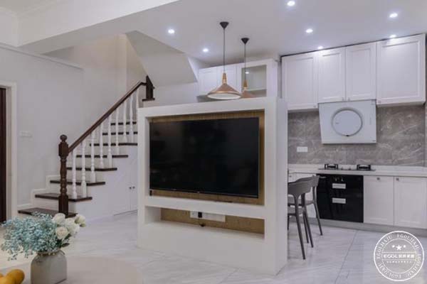樓梯下方空間設計了一整排儲物柜子,增加收納;櫥柜也一起連過來做了通透玻璃高柜,方便后期防止被子紅酒之類物品。餐廳面隔斷中間又做了局部掏空,方便放置小物品也增大視覺效果,告別壓抑。隔斷,屏風他的寓意是有靠山,聚財納福。