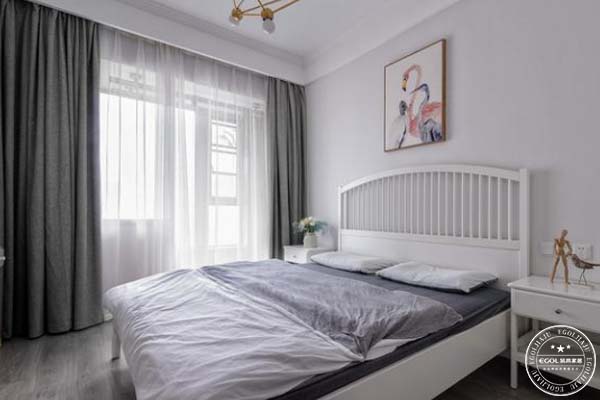 臥室陽臺、床、裝飾畫、插花,北歐風灰白加上局部粉色,真個空間充滿氣質的暖。臥室刷了淡淡的乳白色,和頂部對比可見層次感。