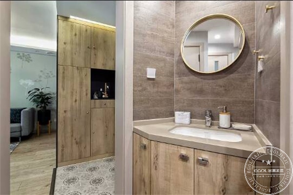 在沒有平行和直角的衛生間,易高設計師提出四室分離方案;在狹小的空間中我們有了獨立的馬桶間,獨立的洗手臺,獨立的淋浴間和浴缸。在早晨衛生間使用最頻繁的時候,讓業主絲毫沒有如廁和洗漱的擁擠和尷尬。