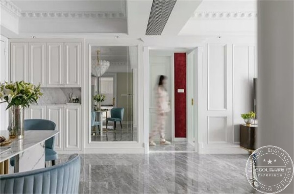 玄關(guān):入戶全身鏡的設(shè)置,視覺(jué)上的延伸,讓空間更加明亮且具流動(dòng)性,使用美觀。