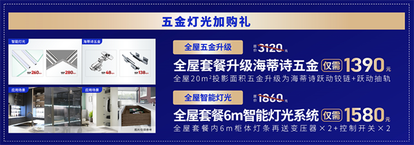 五金燈光作為營造家居氛圍感的重要利器,在家居裝飾方面的作用不可小覷。活動期間,只需+1390元即可將全屋套餐升級為德國進(jìn)口海蒂詩五金,其躍動鉸鏈和躍動抽軌阻尼性能優(yōu)越,能實現(xiàn)有效緩沖,運行平穩(wěn)。值得一提的是,現(xiàn)在僅需1580元即可升級6㎡智能燈光系統(tǒng),隨心定義家居光環(huán)境!