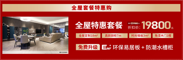 預(yù)算有限的話,也可以考慮19800全屋套餐,僅需19800元,就能獲全屋18平米柜體定制,除了贈(zèng)送高顏廚柜7㎡+時(shí)尚墻板3㎡+免漆木門1樘外,更可免費(fèi)升級(jí)超ENF級(jí)別環(huán)保易居板+防潮水槽柜,一站配齊,一步到位,超高性價(jià)比誰能不心動(dòng)?