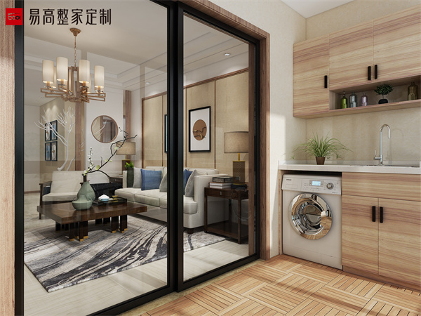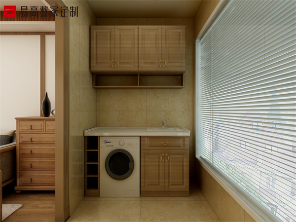定制收納柜加上內嵌式洗衣機柜或者拖把池,可以收納一些家務用品等。不用擔心雜物亂放影響整體的美觀性。都收納在柜子里視覺效果更加美觀,設計時還可以放底板上放置防水墊,以免水珠侵蝕定制柜的板材。