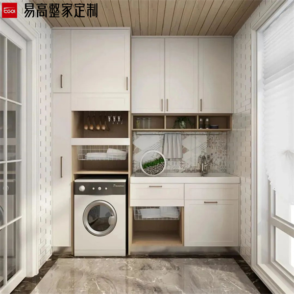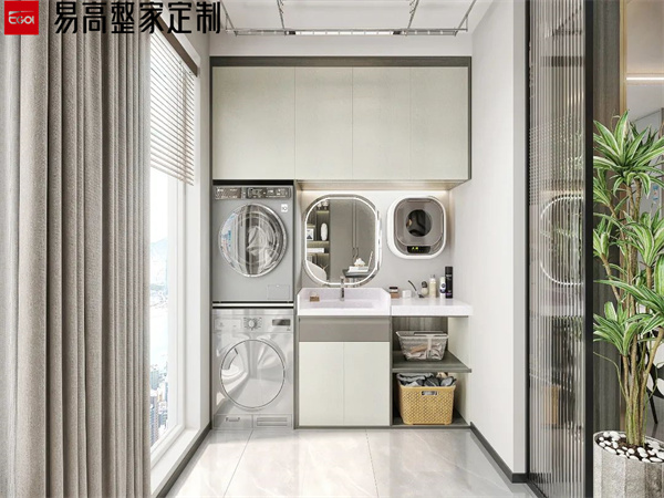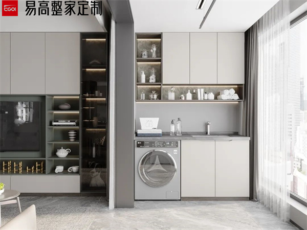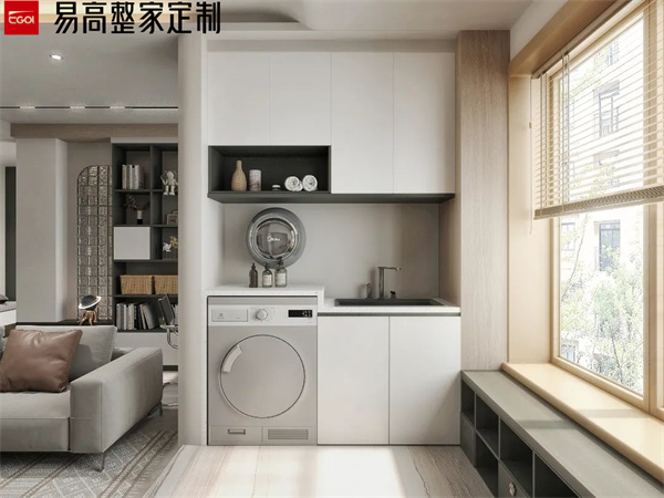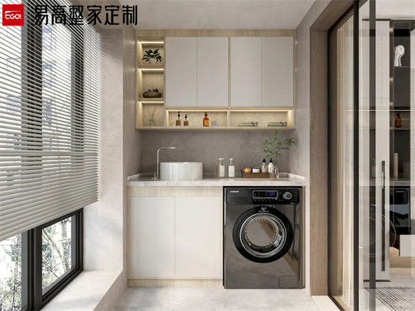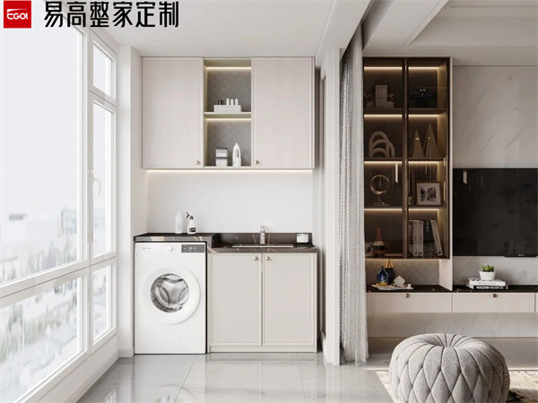 陽臺屬于長期風吹日曬的區域,做陽臺柜一定要注意抗曬和防水問題。避免長期陽光直射導致柜門發黃、開裂等。同時,陽臺柜的臺面也要做好防水處理,避免水漬滲入導致損壞。洗衣柜的材質要選擇防潮性能好的材料,比如磚砌洗衣臺或石英石臺面等,這些材料不僅防腐耐潮,還能抗曬。
