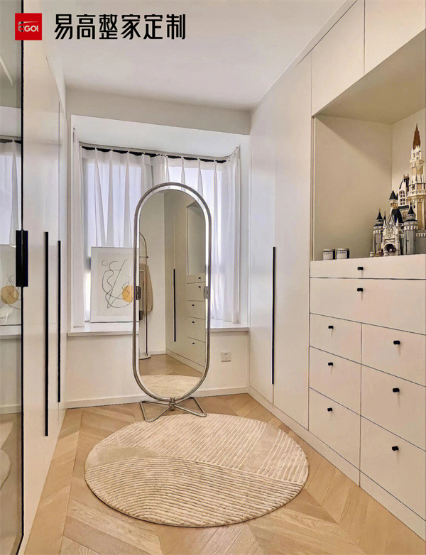 開發垂直空間:到頂設計(2.4m高),頂部40cm放換季物品,底部20cm設抽拉鞋架。推薦多功能組件(升降衣桿、旋轉穿衣鏡、折疊熨衣板)和收納神器(蜂窩內衣盒、伸縮置物架、真空壓縮袋)。注意柜體深度不超過60cm,層板最好可調節。