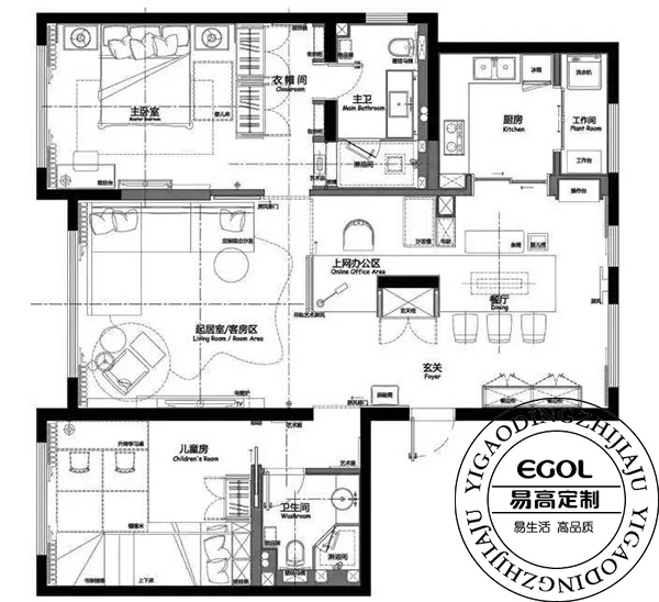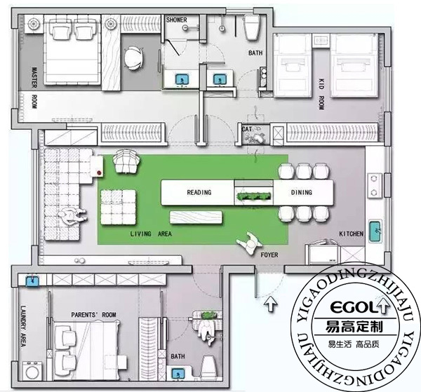 定位為私宅,家庭成員:夫妻+2個女兒(大女兒5歲,小女兒1歲),兩位老人偶爾來住,有書房功能。