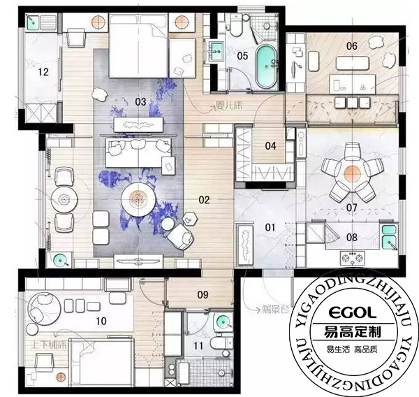 個人很喜歡的一個方案,很符合要求但又不缺乏對生活細節的考究,很贊!但女兒房的上下鋪陳床在那個空間里感覺有點堵,衣帽的使用也不是很方便,如果是小孩子年齡較小的話,反而增加了趣味也不一定,畢竟我們都在用我們成年人的標準在衡量這個世界,還有個問題,作為居家,主臥的隔音問題還是有欠缺。