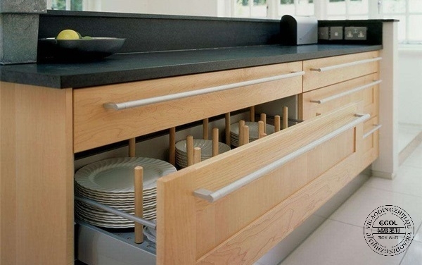 廚柜最好做成抽屜 推拉式這樣方便取放,視覺也較好。而吊柜一般做成30到40cm寬的多層格子,柜門做成對開,或者折疊拉門形式。