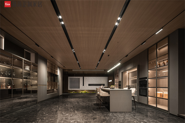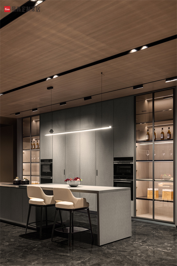開放式西廚設計高端大氣,深灰色系的大面積鋪就暈染出神秘深邃的空間氛圍,體現(xiàn)對都市質(zhì)感生活的不懈追求。裝飾頂柜背板采用前后錯位設計,在燈光和玻璃的折射作用下將空間立體感層層推進,凸顯深厚的家居美學底蘊。