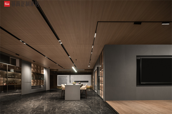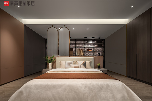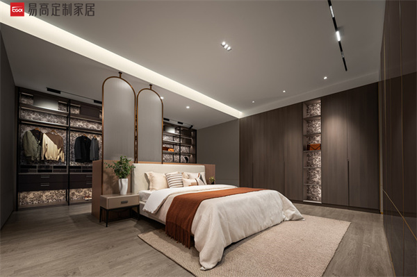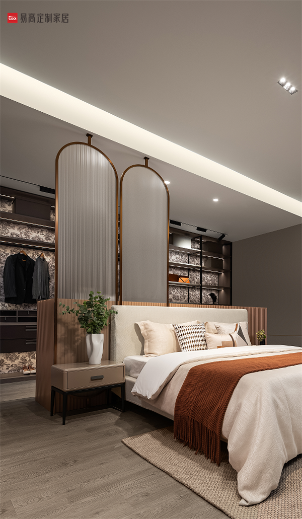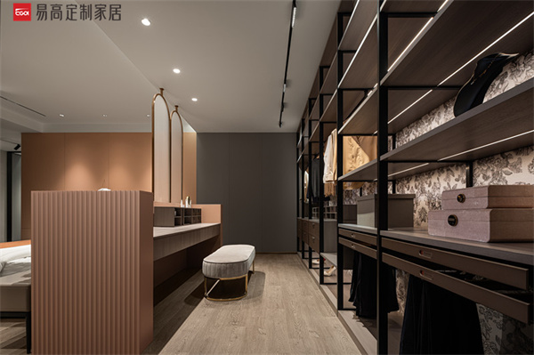 整個空間以利落的線條有序勾勒,盡顯奢雅的貴族姿態(tài)。掛衣區(qū)、收納區(qū)、梳妝區(qū)、休息區(qū)功能劃分明確,實現(xiàn)美學性和實用性的微妙平衡。背板獨特的絨花噴繪工藝,為空間注入不一般的時尚張力,如一幅藝術畫卷悄然綻放,熱情、悠然、不羈。