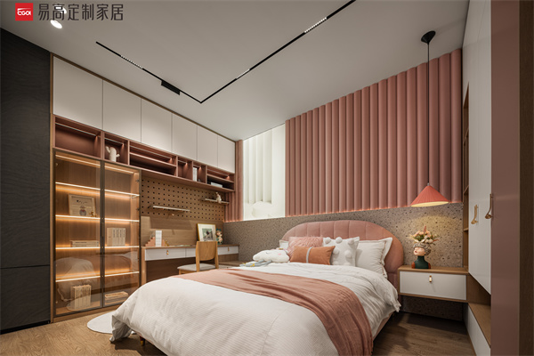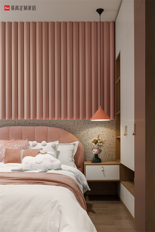 整體空間融入燭光粉的溫柔與膚感白的純凈,隨處縈繞著甜美可愛的氣息。趣味洞洞板和防撞背景墻設計,安全貼心,衣柜、書桌一體化定制,滿足學習、收納等成長需求,讓孩子在童話般的小天地里盡情擁抱幸福和自由。