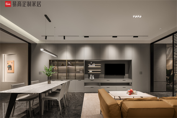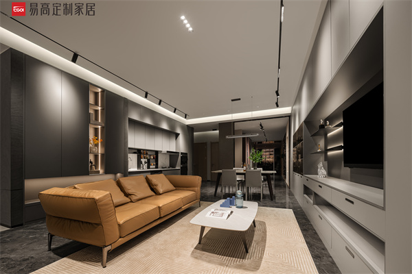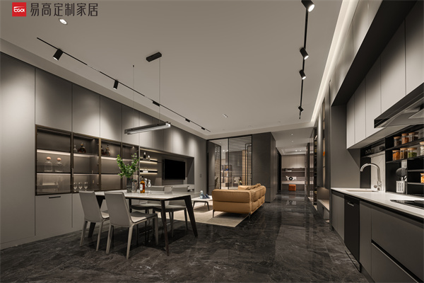 客餐廚一體化設計,開放式布局消融彼此界限,加強空間之間的功能與美學聯系,促進社交互動。全系愛格板和先進的激光封邊工藝,在深沉色系的包裹下,呈現出天生不凡的高端生活質感。亮色軟裝在視覺中跳脫出來,令空間張力十足。