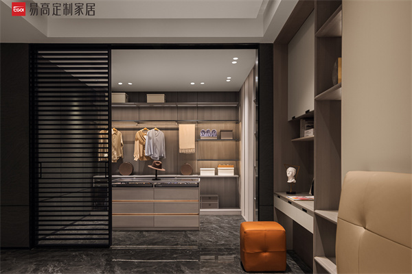 以刪繁就簡的手法將自然引入室內,木質的色彩和流暢的線條在空間自由流轉,創造出優雅靜謐的空間韻律。黑線格柵作衣帽間的隔斷移門,大小不一的層體架構讓生活擁有更多可能性,恰如其分得詮釋出低調儒雅的空間個性。