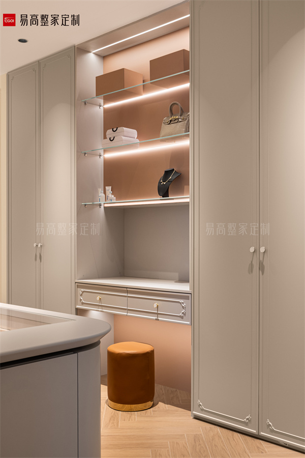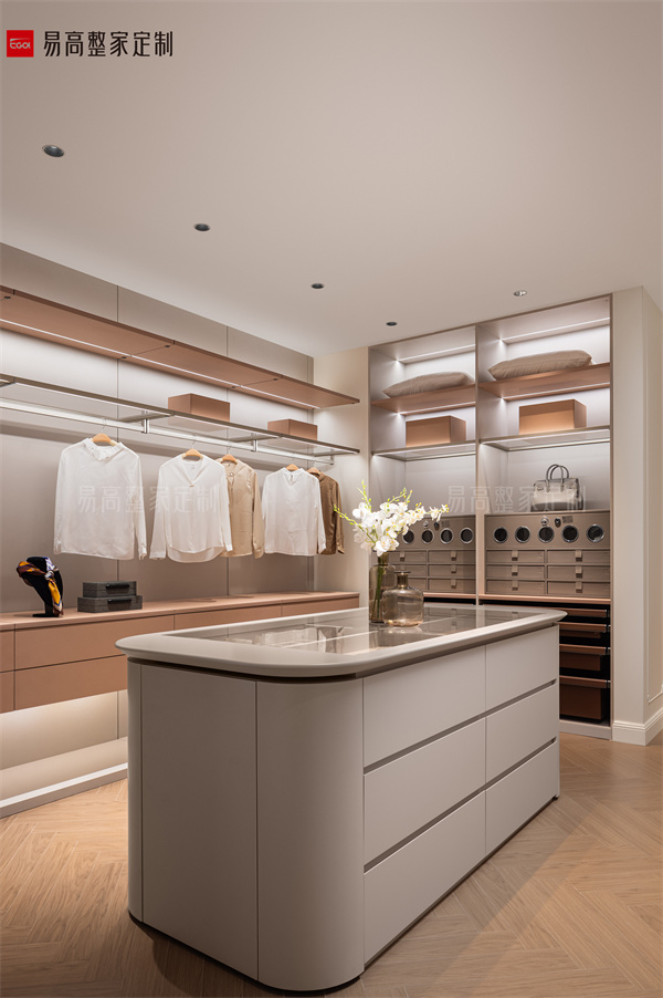 設(shè)計師巧妙運用直線和曲線的交匯,創(chuàng)造出剛?cè)岵?jì)的大氣美感。開放式衣帽間系統(tǒng)和升降梳妝臺藏露有序,將空間層次層層推進(jìn)。流動的步履中,舉手投足間都縈繞著奢雅、隨性的氣息,舒享品質(zhì)人居。