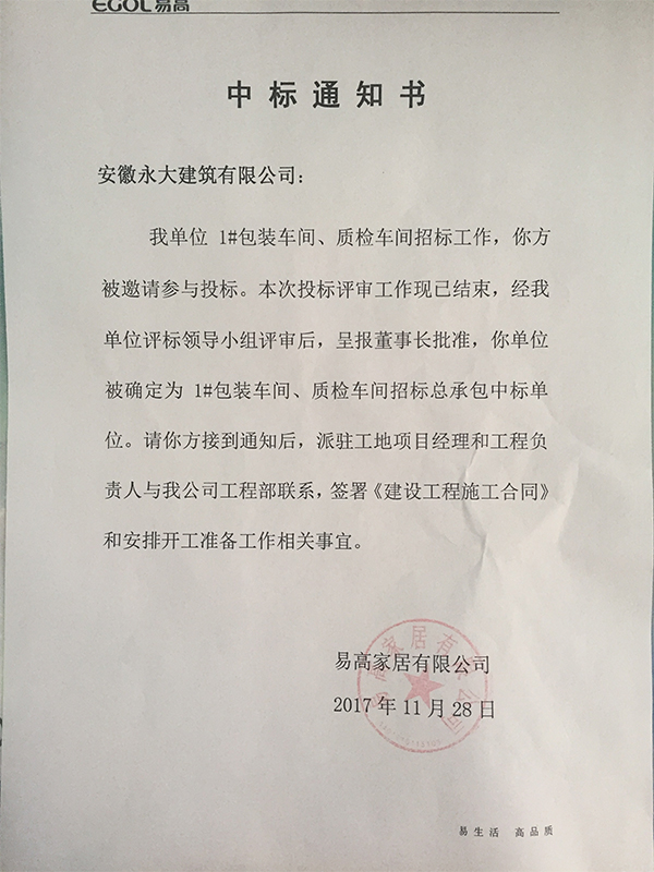 關(guān)于易高定制家居1#包裝、質(zhì)檢車間招標結(jié)果公示